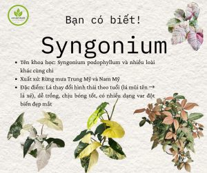 Tên khoa học: Syngonium podophyllumHọ thực vật: Araceae (họ Ráy)Xuất xứ: Rừng mưa nhiệt đới Trung và Nam Mỹ Cây Syngonium – còn được biết đến với tên gọi dân